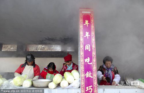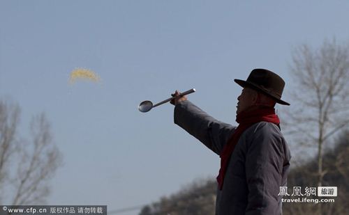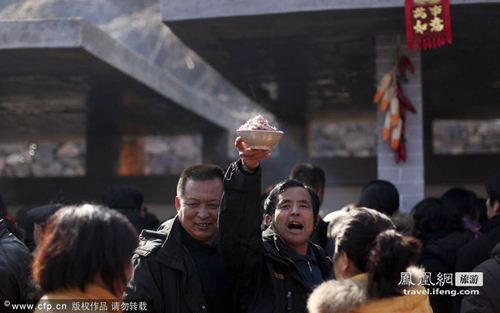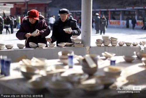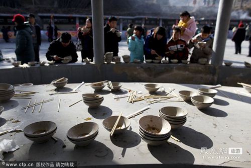 2012年2月5日,游客在吃“敛巧饭”。当日,北京市怀柔区琉璃庙镇杨树底下村传承了近200年的国家非物质文化遗产民俗“敛巧饭”在村文化广场热闹开锅。5000多名游人现场与村民一起品尝百年“敛巧饭”。现场同时使用80口大锅,总共备了10头猪、2000斤白菜、400斤冻豆腐、700斤粉条,小米、大米等共五千多斤。