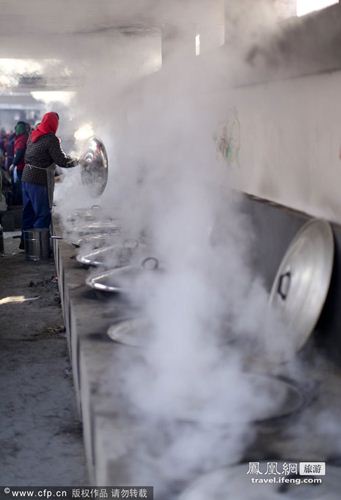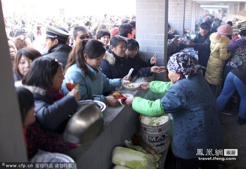 不到两个小时,80口大锅里煮的2000斤白菜、400斤冻豆腐……被来自四面八方的游客一扫而空。2012年2月5日(昨天),怀柔区琉璃庙镇杨树底下村的古老风俗“敛巧饭”吸引了5000游客。