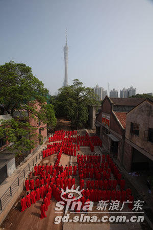 8月31早上8点30分,广州客村艺苑北路的创意园内,以广州的新地标亚洲最高建筑物广州电视塔为背景,280位来自广州市绿茵阁连锁餐饮有限公司在广州各大连锁店的厨师和服务员们,他们要完成一件充满创意的行为艺术——中国红未来,以此表达他们对建国60周年的深情祝福,同时也来庆祝绿茵阁连锁餐饮有限公司成立20周年。