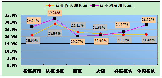 从经营增长能力来看,各业态营业收入和营业利润的平均增长幅度都超过了20%,增长幅度均超过了全社会餐饮收入的增长幅度。其中营业收入增长幅度排名前三的业态分别是快餐送餐、西餐、火锅,而从营业利润来看,快餐送餐、休闲餐饮以及餐馆酒楼表现突出。