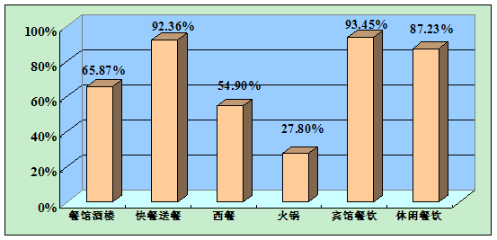 从经营业态来看,餐馆酒楼、快餐送餐以及火锅类企业依然是百强榜单中的主力军,占据了84个席位,与2009年度相比多了4个席位。前10强涵盖了除西餐外的所有业态,火锅类企业依然是前10强企业中的佼佼者,占据4个席位,紧随其后的是餐馆酒楼和快餐,但从前50强来看,餐馆酒楼类企业多于火锅类企业。快餐类企业虽然从前10强和前50强的席位数来看,不及火锅及餐馆酒楼类企业,但上榜企业的营业额总和高居榜首,占百强企业营业额的比重接近40%,比餐馆酒楼和火锅类企业的占比约高出了15个百分点。(见表3)。