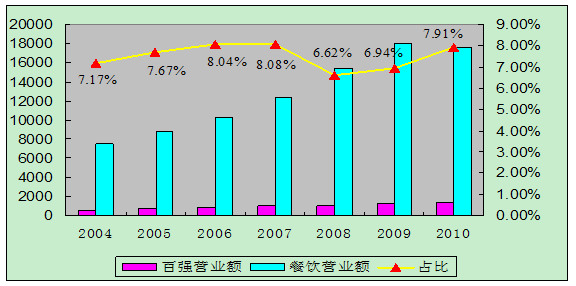图3 2004-2010年度餐饮百强企业营业占全社会住宿餐饮业营业额的比重