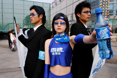 继去年底“雪碧冰薄荷”在中国广州成功上市之后,今年4月,一股酷旋风又席卷津、冀两地。4月2-3日在湖南长沙、株州、湘潭、郴州等主要繁华地区,我司首次引用“真人走秀”的方式为新产品——“雪碧冰薄荷”的上市做热身宣传。此次活动在市场上反映强烈,引起各大媒体的广泛关注,场面异常火爆,“真人秀”酷酷的外形和新颖的组合使在场的观众无不为之吸引,此外,设计巧妙的新产品袖标及条幅通过“真人秀”的方式加以展示,直观且醒目,为我司新产品的推广开辟了崭新的一页,同时,也为新产品的上市奠定了良好的基础。