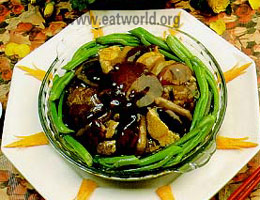 ③将冬菇泡软后,剪下菇蒂,用1杯清汤加油、酱油各l汤匙及糖、葱、姜少许上锅蒸15分钟,滤出排列在中间。