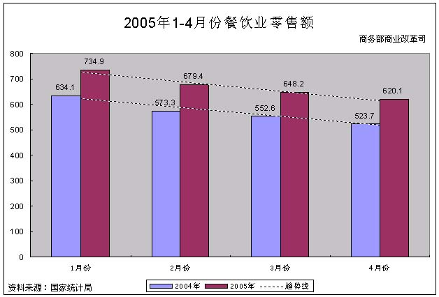 商务部商业改革司根据国家统计局的数据分析,今年4月份全国餐饮业实现零售额620.1亿元,比去年同期增长18.4%,增长速度比去年同期低9.9个百分点(因前年非典疫情去年增幅较大),比上月下降4.3%,高出社会消费品零售总额增幅6.2个百分点,占社会消费品零售总额的13.3%。