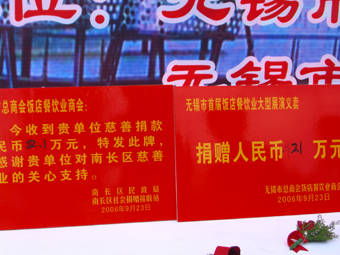 据了解,昨日举行的无锡饭店、餐饮企业大型名菜点展演义卖活动,是由无锡总商会饭店餐饮业商会组织的,目的是为了在太博会期间展示无锡饭店、餐饮企业的风采,展示企业家形象,做大做强无锡饭店、餐饮业。同时各大饭店、餐饮企业义卖捐赠,也是向社会奉献一份爱心,帮助那些最需要帮助的人。自组织方一发起号召,就得到八方响应,一时间报名的饭店、餐饮企业络绎不绝。不少饭店老总反映,在太博会期间举行这样的活动,很有意义。搭建这样一个特殊的平台,能让无锡的著名饭店、餐饮企业,在太博会期间展示自己近年来所取得的成绩,把最美、最好的菜点奉献给无锡家乡人民。因此,参展的作品一定要是精品,老总掌勺不是摆摆炮,而同样要挥勺亮出真功夫。对所展示的菜肴举行义卖,并把义卖全部所得捐给慈善基金会的义举,各大饭店老总表示,正因为有无锡广大市民的支持,企业才有今天的发展和壮大,企业也应回报社会,出点微薄之力。