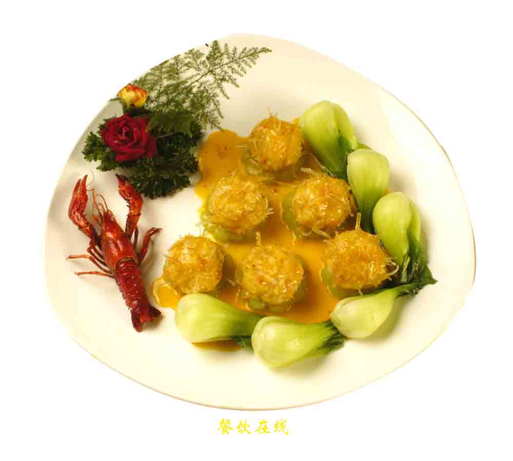 新鲜的青虾,制成球状虾胶,滚上鱼翅放在凉瓜之上,蒸制后浇上蟹黄汁。是道完美而有创意的菜肴,其中富含着多种营养成分。