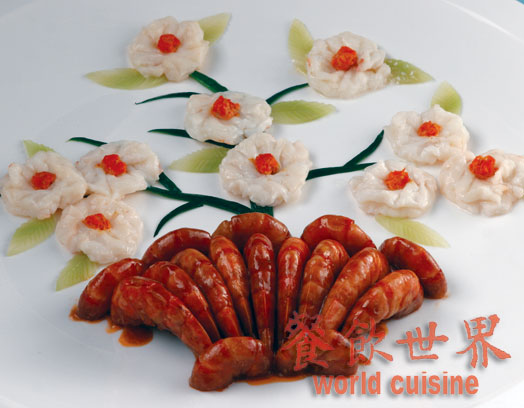 制法:大虾炸熟去头、尾,用番茄酱等烧焖入味,排入盘子下方;另选大虾取完整虾肉,沿一边片剞数刀,加盐等略腌渍,上笼蒸熟取出排入盘中,用熟蟹黄点缀成花形,浇汁即可。