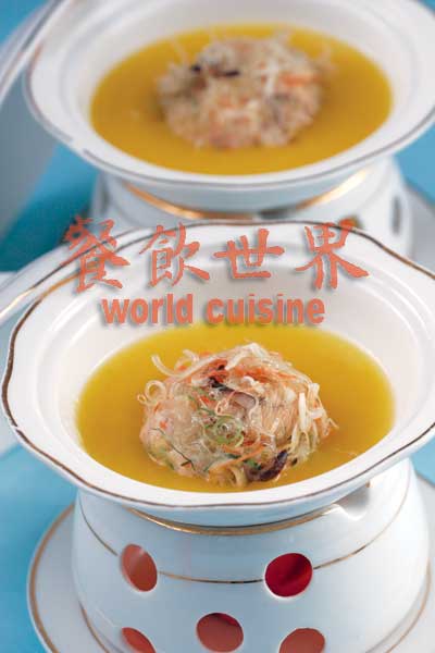 制法:虾仁、海参、鲜贝、鱿鱼剁成泥,马蹄切末,合一起加调料搅上劲,制成球状,再滚粘上鱼翅、香菇丝、冬笋丝、绿葱丝、胡萝卜丝,上笼蒸熟分装碗中,浇调味的高汤即可。