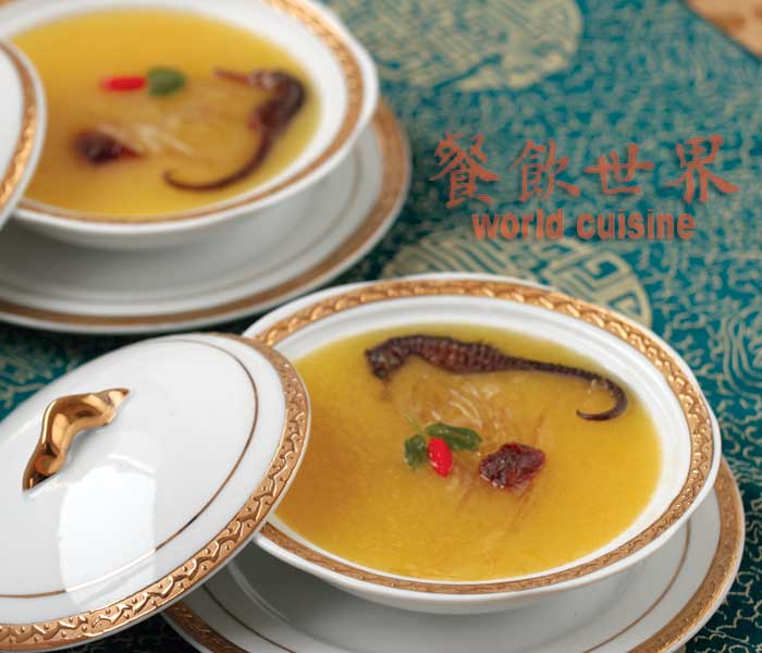 制法:发好的鱼翅焯水后加浓汤、调味品烧焖入味,沥去汤汁后分装入碗;浓汤入锅烧沸,用生粉勾芡,淋入鸡油搅匀,浇入碗中;海马用食盐炒熟,加花雕酒上笼蒸透,与桂圆同放碗中即可。