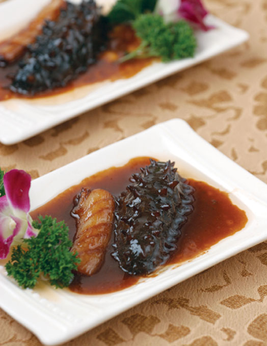 制法:发好的海参焯水,加高汤、生抽、鲍汁等煨焖入味,沥净汤汁备用;葱段入锅煸香至黄色,控油,加高汤略烧,放入海参及其他调味料,烧制10分钟后慢火收汁,装盘并用刻成葵花状的小芒果点缀即可。
