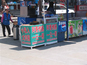 在掉渣烧饼盛极一时的同时,小吃界的另一新生事物--一元烤肠也在悄然之间遍布各个城市的大街小巷。较之于掉渣烧饼,一元烤肠的经营方式更加简单:一个平底煎锅,一个煤气罐,一个盛装烤肠的纸箱,就可以支撑起一个一元烤肠摊点。在长春市一所中学后门的一元烤肠摊点上,每到放学时这里都排起很长的队伍。而烤肠摊点数量之多也是惊人的,仅在长春市火车站前的一处公交车站点,记者就见到近10处摊点经营一元烤肠。一位来自吉林省九台市的摊主告诉记者,她是特意从九台市农村赶到长春市做一元烤肠生意的,尽管竞争很激烈,但每天都能卖出近百根烤肠,利润有40多元。