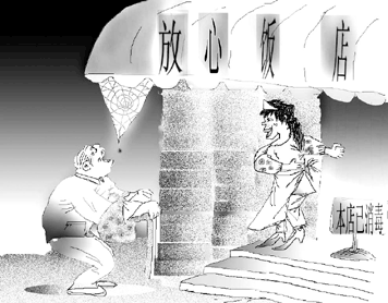 餐馆是个容易出问题的地方,而且一出,就闹得满城风雨。其中,常常引发纠纷的就是餐饮卫生。今年“五一”节,我的朋友到潍坊游玩,他们在一家二星级宾馆就餐时,正巧服务员在一旁清洗餐具。客人亲眼看到,洗碗工将脏碗筷用洗洁精泡过后,并不用清水冲洗,而是直接用抹布一擦了事。据了解,这种“省水刷碗法”并非个别,在一些条件较差的小饭馆、农家院和路边店已为常事。就连那些正规餐馆,也存在着此类隐患。比如豪华餐厅里的餐具往往早已摆放完毕,哪怕三天没客人,各式餐具就这么一直摆在桌上,任凭灰尘四起。而食客倒也司空见惯,很少提出异议。更有甚者,上周我们在北京一家小饭馆吃饭,中午时分,墙角居然出现一只大胖老鼠。同桌的女士不禁惊叫起来,人家反而怪我们过分喧哗。我只好问:“不是你们养着玩的吧?”硕鼠横行,其饭菜卫生可想而知。鼓励食客当场举报,执法部门予以重罚。