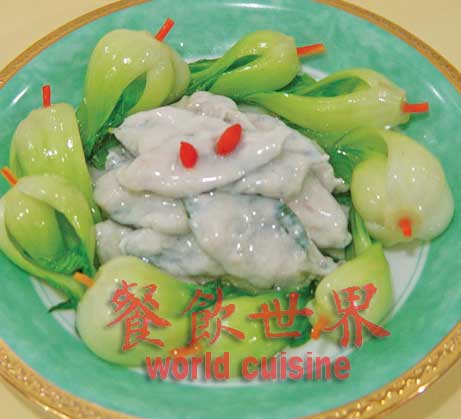 原料:枸杞芽、鸡胸肉、菜胆、料酒、葱姜汁、枸杞子、鸡汤、盐。