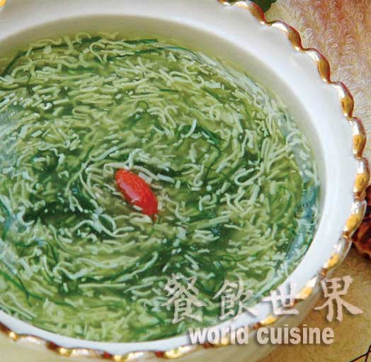原料:枸杞芽、山药、虾仁、花菇、枸杞子、清汤、鸡汁、湿淀粉。
