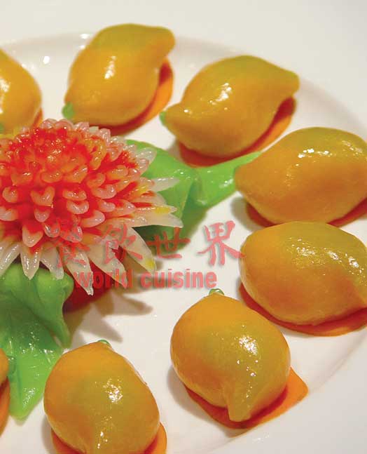 制作:芒果去皮去核,取肉捣烂成泥,拌入糯米粉揉成团,加适量南瓜汁揉匀,下剂包入甜豆沙制作成芒果状,入笼屉小火蒸20分钟取出,刷油上光即成。