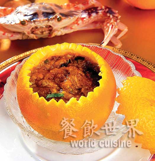 制作:花蟹蒸熟,剔肉备用;甜橙刻盅,取橙肉切小丁。锅内煸香葱姜末,下蟹肉、绍酒、鸡汤、老抽、糖、盐稍炒,加橙肉丁勾芡,酿入橙盅内即成。