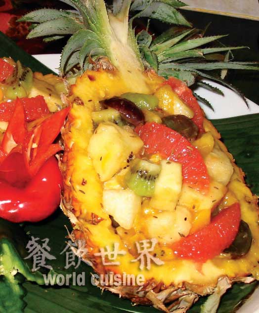 制作:菠萝挖成盅,菠萝肉切丁,提子、草莓、猕猴桃也分别切丁,放入凉透的盐开水中浸泡15分钟,沥水后拌入特制的椰浆和锦糖,装入菠萝盅内,入冰箱冰15分钟,即可食用。