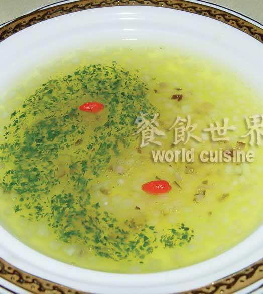制作:枸杞芽焯水后剁碎,山药、花菇、虾仁分别切成米粒状,焯水备用;清汤下锅烧开,下山药、花菇、虾仁,用鸡汁调味,勾薄芡装碗;再用清汤加枸杞芽烧沸,调味勾芡,浇在碗里成太极图状,点缀枸杞即成。