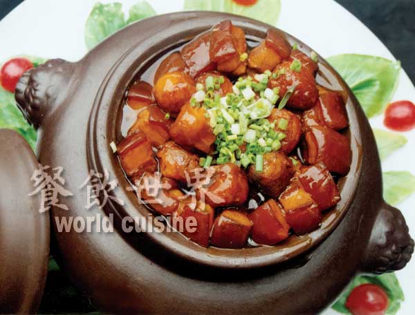 制作:红枣洗净放入沙锅中;五花肉切小块,煸炒出油,沥出多余的油,加入盐、味精、白糖、花雕酒、清汤,烧沸倒入沙锅,烧沸后改用小火炖至汤浓肉烂,撒上葱花即可。