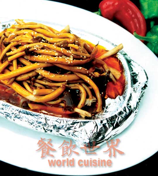 制作:小葱白切丝,放入烧热的铁板中,茶树菇治净,放葱丝上备用;鲍鱼汁入锅,加盐、蚝油等调匀,用湿淀粉勾芡,浇在茶树菇上,撒上熟芝麻即可。