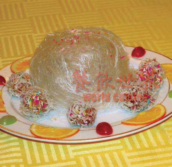 制作:粉丝入热油炸至膨松,捞出截小段待用;芋头蒸熟后去皮压成泥,做成丸子入六成热油锅,炸至外脆捞出,锅留底油,下白糖熬成糖浆,将炸好的芋圆入锅挂匀糖浆,再粘上粉丝和朱古力,排盘边,盘中放抽好的糖丝球即可。