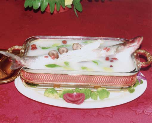 原料:兴凯湖白鱼、野山参、鹿茸、大枣、枸杞、莲子、油菜心、鲜汤、盐、味精、花雕酒、胡椒粉。