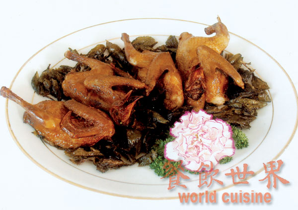 制作:鲜汤放入不锈钢桶中,加入麦芽糖、冰糖、茶叶、盐、味精调制成卤汤备用;乳鸽治净,焯水后放入桶内,烧沸后离火焖30分钟,捞出乳鸽、茶叶备用;锅中放油烧至6成热,下入茶叶炸干,沥油后装盘,再放入乳鸽炸成金黄色,捞出改刀摆盘即可。