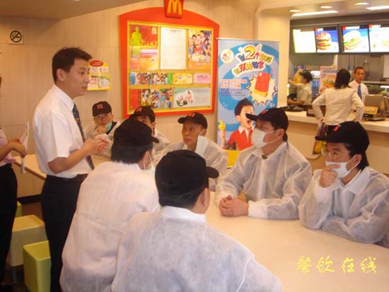 正值就餐高峰的这间麦当劳餐厅约有300平方米,员工们的工作并没有因这么多餐饮专家的造访而受到影响,迎宾、引座、售货、收银------在整个考察的2小时里,均都秩序井然,表现出严格的管理和良好的素质。  为不影响后厨的正常工作和便于介绍讲解,按照店长的要求,考察者分为8人一组,每组考察者间隔10分钟进入操作间,在操作间里,店长根据麦当劳公司全球统一的卫生规范向专家们逐一工序地介绍,使专家们对麦当劳公司卫生规范的实际作用、实施情况及效果有了直观和深入的了解。在各主要工作环节的明显位置,麦当劳的卫生规范都简明扼要地公示,具有很强的可操作性,这引起专家们的很大兴趣。店长介绍说,麦当劳的卫生规范都有专门的文字读本,要求员工熟记,为了确保执行,这些规范都是经过在实践中反复提炼、文字推敲而形成,简单易懂易记,同时主要环节的规范都在员工目所能及的地方以鲜明的色彩标注,使员工一眼便可看到,随时规范和指导自己的工作。