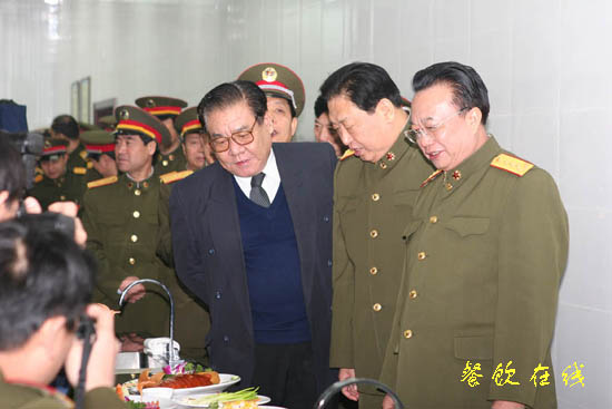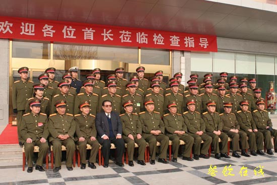 作为中国烹饪协会定点培训基地,华北厨艺楼发挥了重要作用 军区司令朱启(右1)、政委符廷贵(右2)、中国烹协会长苏秋成正在参观厨师们的烹饪作品 军地首长们同官兵们合影留念