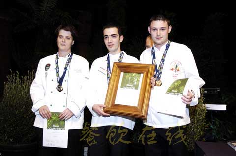 获得汉斯·比斯肯斯青年厨师挑战赛冠军——葡萄牙选手乔诺·西蒙斯(左),亚军——澳大利亚的阿曼达·爱德华兹(中),季军——威尔士的盖瑞·格里菲思(右)