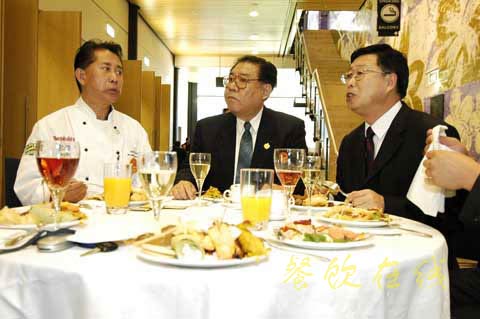 中国烹饪协会苏秋成会长(中)与华裔厨艺大师甄文达(左一)先生亲切交谈