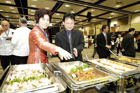 午宴在天空城会展中心举行,此次午宴是由中国申办代表团独家冠名的、中国烹饪协会的烹饪大师现场为大家进行厨艺表演,款待世厨联大会主席、委员及各国代表。中国烹饪协会常务副会长杨柳女士在现场热情地向各国代表介绍中国特色菜肴。独特的东方美食深深吸引着世厨联有关领导及各国代表,得到了他们的一致赞许。