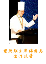 关于世界厨师联合会现状的报告。他再次重申世界厨师联合会应当依照大会烹饪技艺、优质服务、培训教育、品质优异(C-H-E-F-S vision—Cuisine, Hospitality, Education, Food and Service to others)的宗旨,致力于推广食品以及烹饪技法。他还详细的介绍了世厨联当前的工作重点以及思路,包括:积极开展教育培训计划、创建世厨联烹饪大师认证体系以及确保2006年世界烹饪大赛的成功举办等。奥克兰市市长迪克.哈伯德也作了关于工作专业化重要性的简短发言。