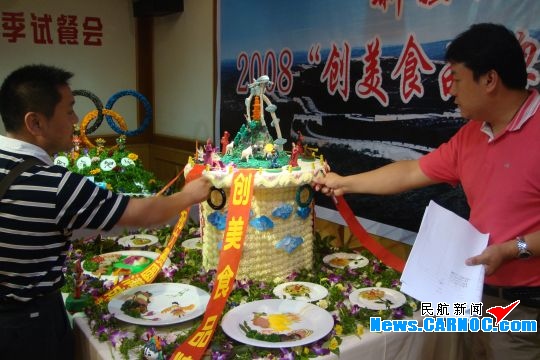 此次大赛,共有43位选手参加,南航航食新疆分公司还专门邀请了新疆著名烹饪大师赵伟担任评委。经过两天的激烈角逐,分别评选出了凉菜、面点和热菜三个项目的一、二、三等奖及各单项奖。而在展台设计比赛环节中,参赛的四个小组各具特色。最终,展台“载歌载舞迎五洲宾客”因巧妙地将美食、奥运、南航和新疆风情融为一体,受到评委一致认可而获得了展台设计一等奖。