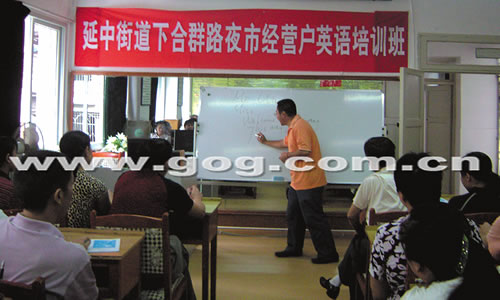 近日,一阵阵朗读英语单词的声音从云岩区延中街道办事处团结社区远程教育室传出来,这是延中街道为提高下合群路餐饮夜市的服务质量和夜市形象、迎接奥运和贵阳避暑季的到来而对经营从业人员举办的英语课堂。