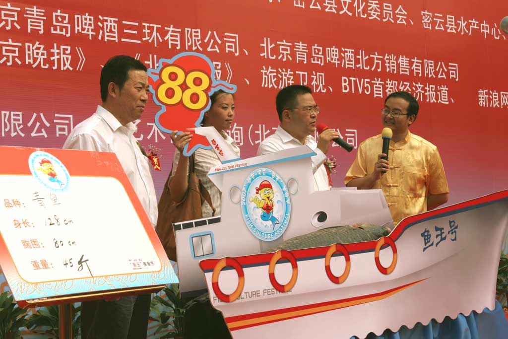 来自北京市农委、北京市文联、北京市工商局、北京市水务局和北京市农业局等单位的主要领导以及密云县县委、县政府、各委、办、局、及各乡镇主要领导出席了开幕式。 开幕式上县委常委、常务副县长刘福志首先致词。他说:按照首都水源区发展战略,密云县委、县政府提出了创建国家生态县的奋斗目标。通过大力发展生态经济,营造生态环境,建设生态人居,塑造生态文化,构建和谐社会,打造出“生态密云、休闲之都”品牌,有效地促进了密云生态环境和经济社会全面、协调、可持续发展。也为首都的环境改善和长远发展、为2008年奥运会做出了应有的贡献。 旅游局副局长安居民简要介绍本次鱼王美食节和金秋采摘节活动情况:今年的“鱼王”美食节由三部分系列活动组成,一是结合2008年密云水库建库五十年,推出了“密云水库建库五十周年图片展”活动,使广大旅游者在活动中重温密云水库五十年的光辉历史,唤起更多的人珍惜首都生命水源。图片展将在北京20个社区分阶段进行巡展。二是增添了环密水库自行车骑行活动,其目的是宣传密云生态环境,激发保护首都水源地热情,感受密云县社会主义新农村建设成果。 中国环境促进会副秘书长王中兴、北京市农委主任李进山分别在会上发言。 作为今年密云县生态文化节的重点项目,本届鱼王美食节活动自7月份就开始了紧张的策划和筹备,相比上届的鱼王美食节活动,本届具有新的突破。活动不仅有水库放生、开库庆典、鱼王拍卖、野钓比赛等活动,还举办了吉祥物征名、赶渔集、野外寻宝等一系列精彩活动。 另外,还隆重推出了一日游、两日游金秋采摘线路。水库周边近百家的精品果园、采摘园,可以让游客尽情的采摘到葡萄、梨、板栗等十余种优质干鲜果品。在1公里长的溪翁庄鱼街,30多家渔餐馆开门迎客,游客可在这里品尝到酱炖鱼头、垮炖鱼、红烧鲤鱼、氽花鲢等十几道库鱼美食,还可以在附近集市上买到各种鲜鱼和“渔品”。 美丽的密云养育了纯朴善良的密云人,纯朴善良的密云人保护着山清水秀的密云,山清水秀的密云邀请八方宾朋体验原生态山水的密云。 秋风送爽,鱼王送福。鱼王拍卖活动将开幕式的气氛引向高潮。伴随着优美的舞蹈,第一条鱼王上场了,这是一条鳙鱼,身长99厘米,胸围72厘米,体重27斤,起拍价5万元。经过一番竟拍,这条鳙鱼最终以12万元卖出,得主是密云冶金矿山公司。 在小朋友“开渔啦”童声中,第二条鱼王隆重上场,这也是一条鳙鱼,身长105厘米,胸围78厘米,体重31斤,起拍价10万元。在牌子的起起落落中,这条鳙鱼以18.8万元的价格,被北京城建六公司拍走。 第三条鱼王的上场,将整个拍卖活动推向高潮。这条重达22.5公斤的1号“鱼王”是一条青鱼,由溪翁庄镇石马峪村的渔民张国华所捕。这条鱼身长128厘米,胸围80厘米,据他估计,这条鱼在水库里至少生长了10年。起拍价23.6万元。不同于前两条鱼王的是,第三条鱼王的竟拍尤为激烈,竟拍价一路飙升。最后,这条鱼王以32.8888万元的天价被北美投资集团拍得。 本次鱼王美食节拍卖三条"鱼王"所得拍卖款共计63.6888万元,将成立两个基金会,由密云县和中国绿化基金会联合成立"密云水库生态涵养基金",用于保护密云水库水环境,另一项是和中华慈善基金会联合成立"密云水库上游希望助学基金",用于资助水库上游地区学生完成学业。县委常委、常务副县长刘福志代表县政府将拍卖所得善款捐赠给了北京水源保护基金会,并将其中的25万元拍卖款现场赠给了河北省赤城县副县长王秀冬,用于赤城县的教育事业,以此感谢赤城人民为保护密云水库上游环境做出的巨大贡献。原县政协主席、北京水源保护基金会理事长郑亚娟代表北京水源保护基金会向三位鱼王得主赠送了纪念品,感谢他们保护密云水库的义举。 近年来,密云县委、县政府结合北京生态涵养发展区和首都水源区功能定位,认真研究县域资源优势,以打造生态环境、实施“221行动计划”、培育区域特色产业为切入点,紧密结合区域农业资源,不断挖掘农业的生活功能和服务功能,着力发展休闲旅游业取得了阶段性的效果。既较好地保护了水源区生态环境,又创出了加快农民增收的可行路子。相信随着密云生态建设的不断深化,密云生态环境的不断提升,密云都市型现代农业的发展会迈上一个新台阶,密云的新农村建设会取得更大的成效。同时,密云水库有机鱼和鱼王美食节的品牌也将不断扩大市场影响力,成为北京都市型现代农业发展的一个新亮点。