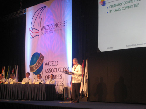 5月14日 ,正在阿联酋迪拜出席世界厨师联合会第33届大会的全体委员,向中国红十字会捐献5000美元,以表达对中国地震灾区的援助之心,大会上特为此举行了捐助仪式。中国代表团团长中国烹饪协会会长苏秋成代表中国烹饪协会和中国灾区人民对世界各国厨师代表的捐赠表示衷心地的感谢。
