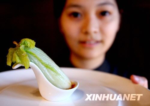 用娃娃菜制作的与清代藏品翠玉白菜极像的菜肴“翠玉白菜”
