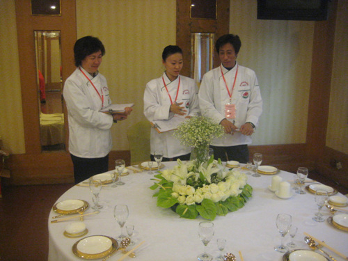 服务评委正在讨论餐台的摆放
