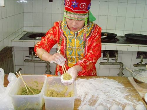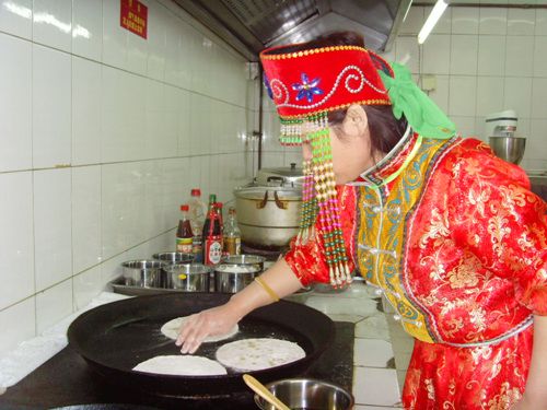 在辽宁赛区比赛现场,有一位身着少数民族服装的女选手,她是来自辽宁省阜新市佛寺镇的蒙古族选手白玉华。白玉华为了参加这次五年一届的全国大赛,做了充分的准备,在比赛现场,她带来了自己最拿手的、也是最具有民族特色的面点作品——蒙古贞馅饼,据白玉华介绍,这种馅饼是蒙古族人待客的最好食品,平时需要两个人一起做,一边拍饼一边烙,烙的时候火候很关键,中间鼓起来的饼才香,不但皮薄透亮,而且金黄油亮、鲜香可口。今天就自己一人虽然在操作上有一定的难度,但是有信心发挥出最好水平。