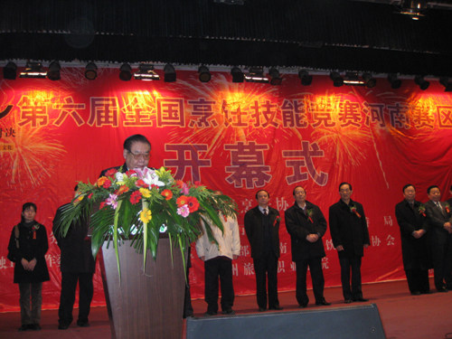中国烹饪协会会长苏秋成参加开幕式并讲话。他首先代表中国烹饪协会向第六届中国烹饪技能竞赛(河南赛区)成功举办表示祝贺,向来自河南各地选手和省外评委表示热烈欢迎,向大赛组委会河南省餐饮行业协会和广大餐饮企业表示衷心感谢。他讲到,中华饮食文化博大精深,源远流长,丰富多彩的河南饮食文化,又是中华饮食文化中的瑰宝,河南省位于我国中部,人口大省,有广阔的市场需求,希望通过这次大赛进一步提高豫菜品牌建设,来彰显豫菜风采,弘扬河南饮食文化。参加开幕式的来宾还有河南省第十届人大常委会副主任张以祥、中国烹饪协会副会长孙应武、河南省餐饮行业协会会长曲安民等领导。