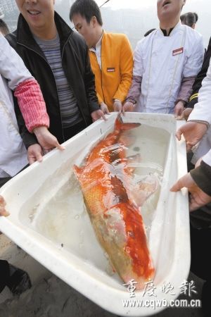 前晚,几位渔民在嘉陵江江北嘴水域无意捕到一条重29公斤、长达1.3米的胭脂鱼。昔日的打鱼人、现“鑫缘渔港”老板张学兵知道此事后,花1.2万元将胭脂鱼买下,并将其放生。据悉,这条胭脂鱼是我市至今发现最大的野生胭脂鱼。