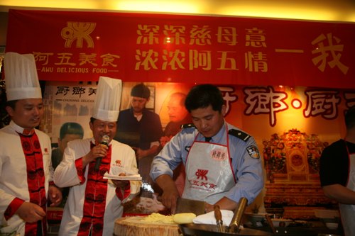 母亲节前夕,由河南阿五美食等联合郑州市公安局特警三大队、河南建业外国语中学共同主办的“深深慈母意、我为母亲做道菜”活动隆重举行,旨在倡议大家用做饭的形式表达对母亲的感谢和爱。在活动现场,全国公安系统抗震救灾英模、郑州市五一劳模、学生、顾客、烹饪大师等十余名代表,亲手为自己的母亲现场做菜,用“美食”传递着大爱无疆。