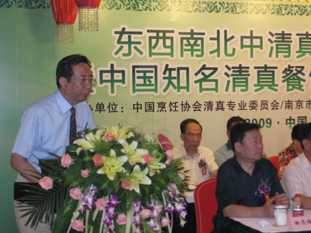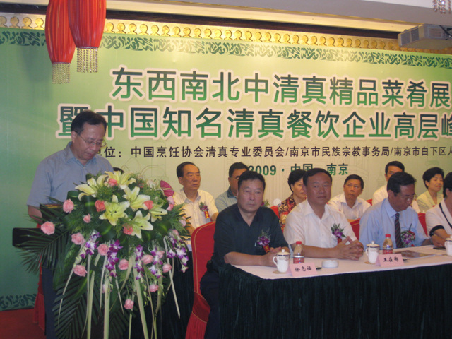 7月27日上午,由中国烹饪协会清真专业委员会、南京市民族宗教事务局及南京市白下区人民政府联合举办的“东西南北中清真精品菜肴展暨中国清真烹饪企业高层峰会”开幕式在南京市清真安乐园菜馆举行。中国烹饪协会冯恩援秘书长,南京市委常委、统战部部长钱继红,南京市政协副主席俞明和来自全国19家知名清真企业负责人,来自全国14个省市的知名清真企业烹饪大师及少数民族群众代表约150人出席了开幕仪式。