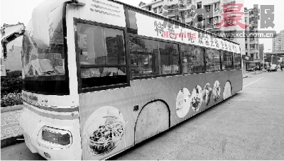 昨日下午,记者在金苹果扬帆大市场中心干道东侧见到了这辆“雷人”的公交车,车前窗玻璃上“高叶塘—305—王家湾”、车前门“严禁携带易燃易爆品上车”的字样还清晰可见,而车身则喷绘了各种美食图片,白底红字的广告语写着“特色小吃欢迎光临凉面酸辣粉”,在另一侧写着鸡腿、里脊肉等各种小吃的价目,此外,车窗玻璃上写着“金苹果小卖部扬帆分店”,从外观上看,公交车玻璃完好无损,只是4个车轮已经卸掉。