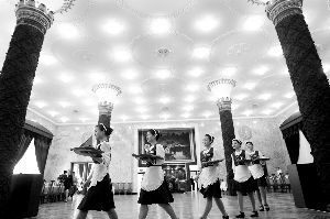 今天,莫斯科餐厅经过三个月的装修,重新开门迎客。据餐厅负责人介绍,为了尽可能恢复原貌,他们走访了很多老员工回忆模样。记者昨天得以到装饰一新的餐厅内探访,看着天花板的雪花顶、墙壁上的手绘壁画以及打磨清洗一新的大理石墙面、铜柱,时光仿佛重回到55年前。
