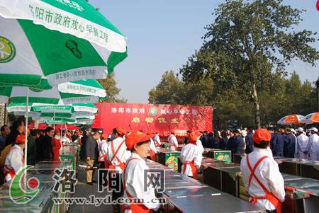 5日上午,洛阳市在周王城广场举行隆重仪式,正式启动“放心早餐”工程。洛阳早餐经营从此进入规模化、规范化发展时期。即日起,每天早晨的5时至9时,211辆流动餐车将走向涧西、西工街头、社区,为附近市民提供统一标准、统一生产、统一配送的营养、卫生、方便、快捷的早餐服务。