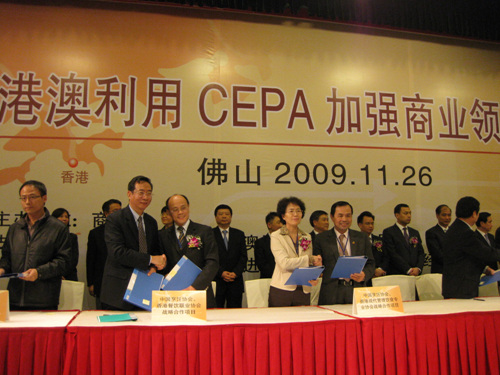 在“全国商务系统落实CEPA示范城市佛山现场工作会” 上,四个“落实CEPA示范城市”代表就落实CEPA及与港澳经贸合作情况介绍了经验,有关省市进行了交流。