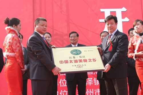 中国烹饪协会副会长朱刚为震泽镇“中国太湖美食之乡”授牌